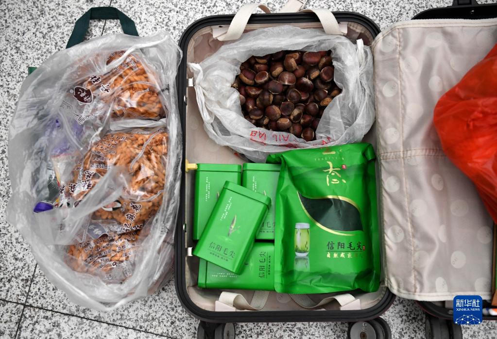 劉紅善行囊里裝的家人給準備的信陽(yáng)特產(chǎn)茶葉和板栗等(1月26日攝)。