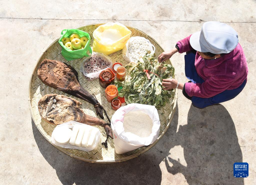 云南省大理白族自治州劍川縣馬登鎮文屏村人張茂盛即將裝進(jìn)行囊里的物品(1月26日攝),有父母親手制作的火腿,當地特產(chǎn)餌塊和豬肝胙、豆豉和白蕓豆等。
