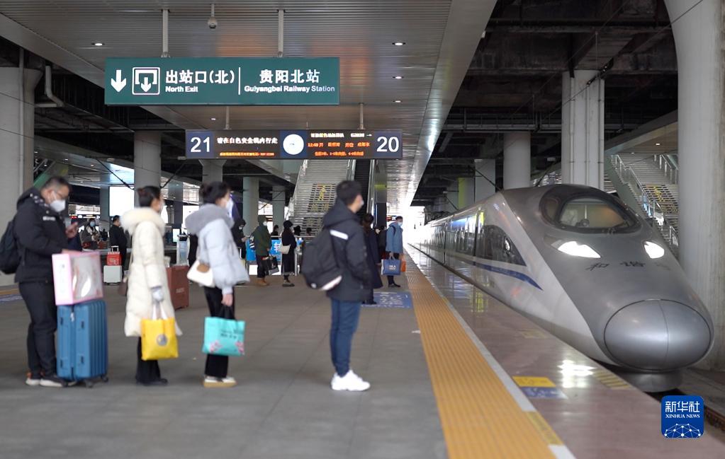 1月27日,旅客在貴陽(yáng)北站站臺上候車(chē)。