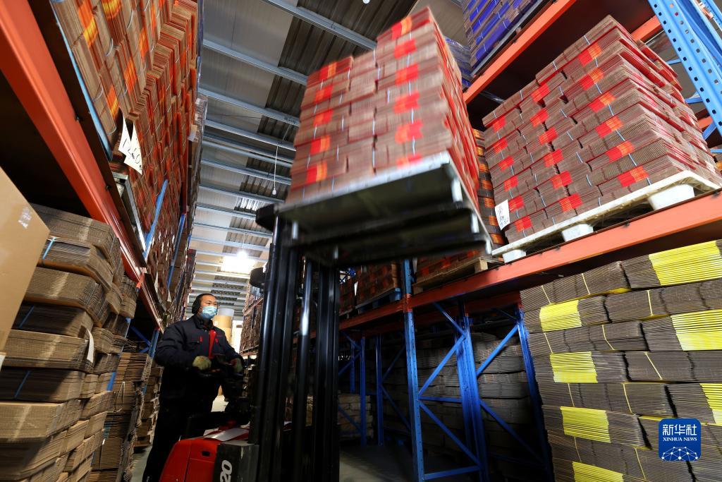 1月27日,在山東棗莊經(jīng)濟開(kāi)發(fā)區一家彩印企業(yè)車(chē)間,工人運送生產(chǎn)的印刷產(chǎn)品。
