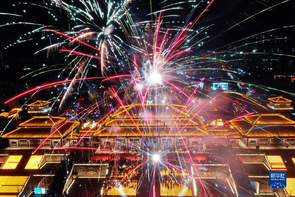 1月27日晚,游客在山東省郯城縣郯國古城景區觀(guān)賞煙花(無(wú)人機照片)。
