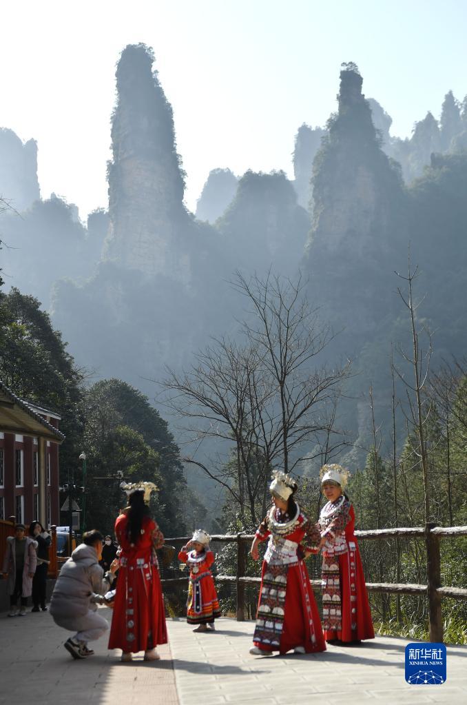 1月27日,幾位游客在張家界國家森林公園游覽,身著(zhù)苗族服飾拍照留念。