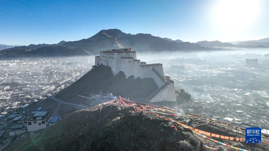 1月24日拍攝的日喀則市的清晨(無(wú)人機照片)。西藏日喀則地方藏歷農家新年期間,藏族群眾沿襲傳統,一大早就在山頂和自家屋頂上豎起新經(jīng)幡,祈愿新年風(fēng)調雨順、國泰民安。