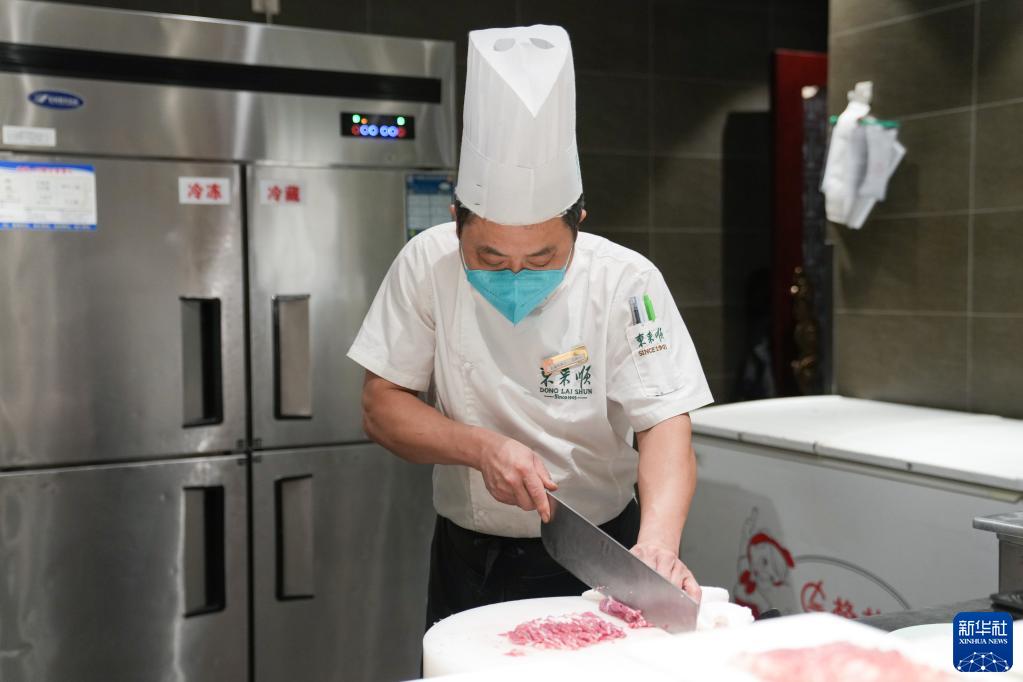1月28日,在北京東來(lái)順飯莊總店,廚師馮炳山在切節后開(kāi)工第一天的第一盤(pán)鮮羊肉。