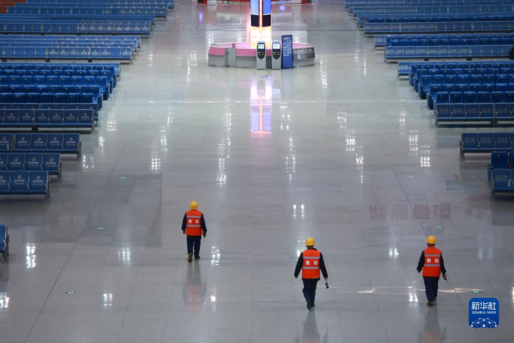 1月29日,工作人員走在空無(wú)一人的貴陽(yáng)北站候車(chē)大廳內。