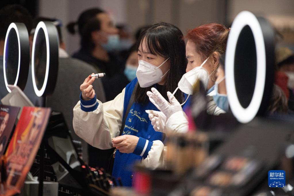 1月29日,消費者在中免集團??谌赵聫V場(chǎng)免稅店選購化妝品。