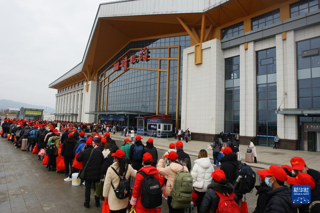 1月29日,務(wù)工人員在云南省曲靖市高鐵北站排隊進(jìn)站。