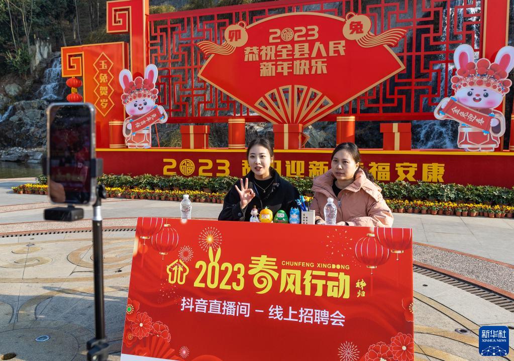 1月29日,用人單位在湖北省宜昌市秭歸縣的新春人才招聘會(huì )上進(jìn)行直播,線(xiàn)上介紹崗位信息。