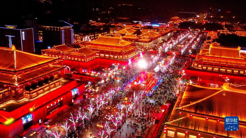這是1月28日拍攝的西安大唐不夜城步行街區(無(wú)人機照片)。