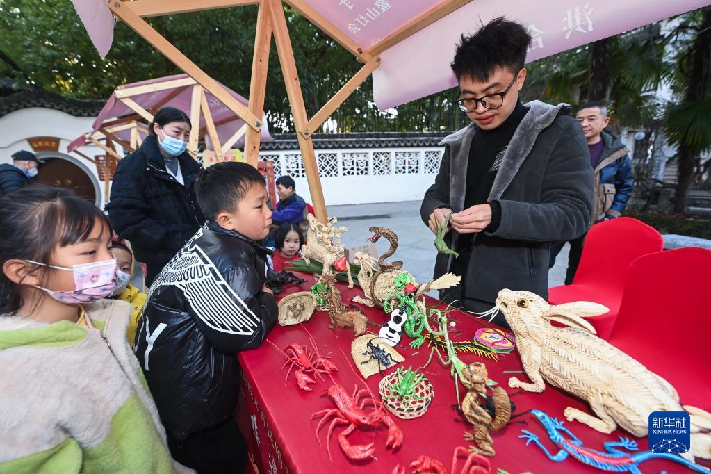 1月29日,在嘉興市秀洲區新塍古鎮小蓬萊公園內,傳統藝人(右)在“鰲山燈會(huì )”現場(chǎng)展示手工技藝。