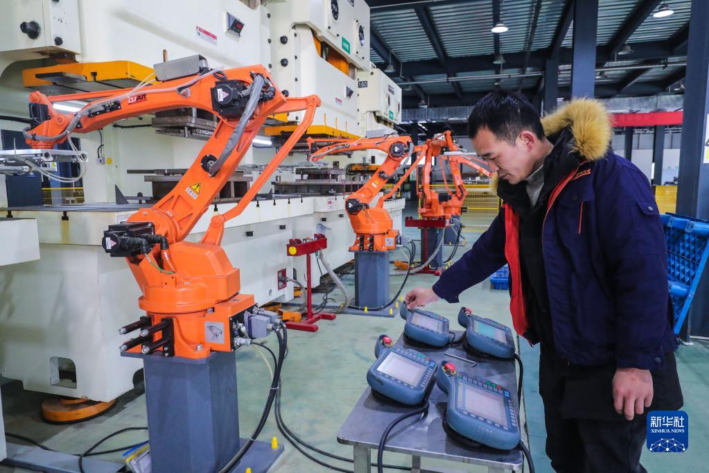 1月29日,在河南省信陽(yáng)市光山縣三元光電科技扶貧車(chē)間內,工人操作機器人趕制新年訂單產(chǎn)品。