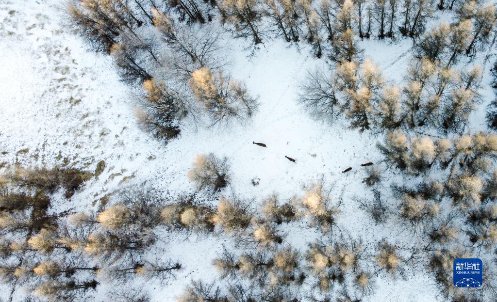 1月29日,一群馬鹿在灤河源國家森林公園內覓食(無(wú)人機照片)。新華社記者 賀書(shū)琛 攝
