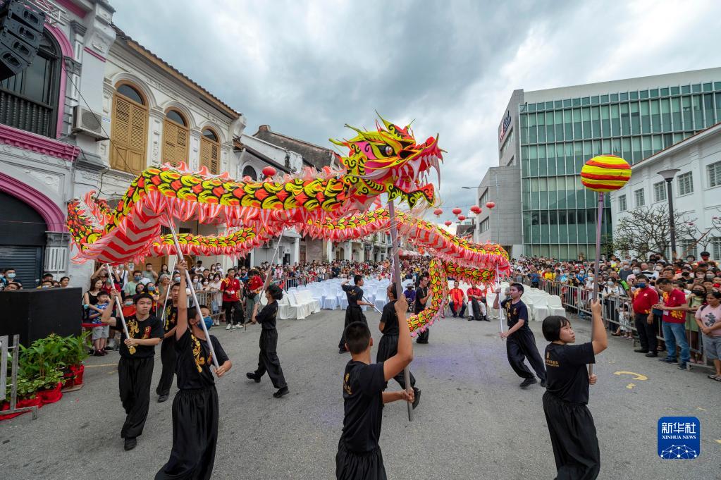 這是1月28日在馬來(lái)西亞檳城州首府喬治市舉行的檳城廟會(huì )上拍攝的舞龍表演。