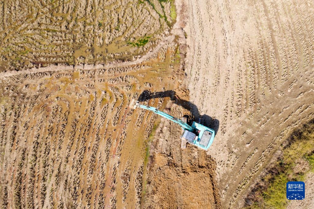 1月29日,在江西省撫州市金溪縣秀谷鎮五里村高標準農田建設現場(chǎng),施工人員開(kāi)動(dòng)機械設備建設高標準農田。