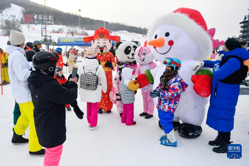 在吉林市萬(wàn)科松花湖度假區,小朋友們與卡通人偶互動(dòng)(1月23日攝)。