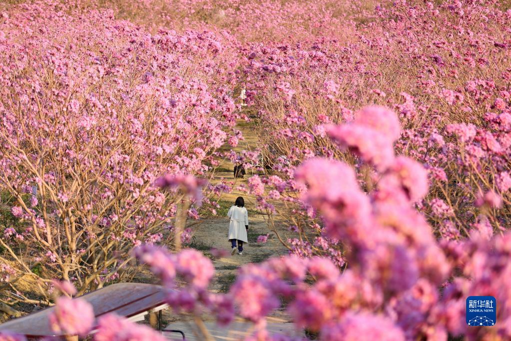 1月29日,游客在江門(mén)市新會(huì )區大澤鎮山頭坪游玩賞花。