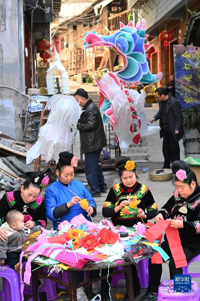 1月30日,民間藝人在貴州省黔東南苗族侗族自治州臺江縣臺拱街道文山村編扎“亮龍”和花燈。