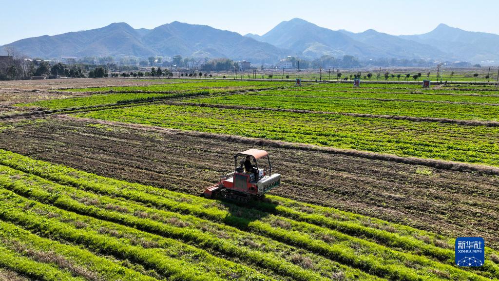 1月30日,湖南省常寧市洋泉鎮杉樹(shù)村村民駕駛農機翻耕農田(無(wú)人機照片)。