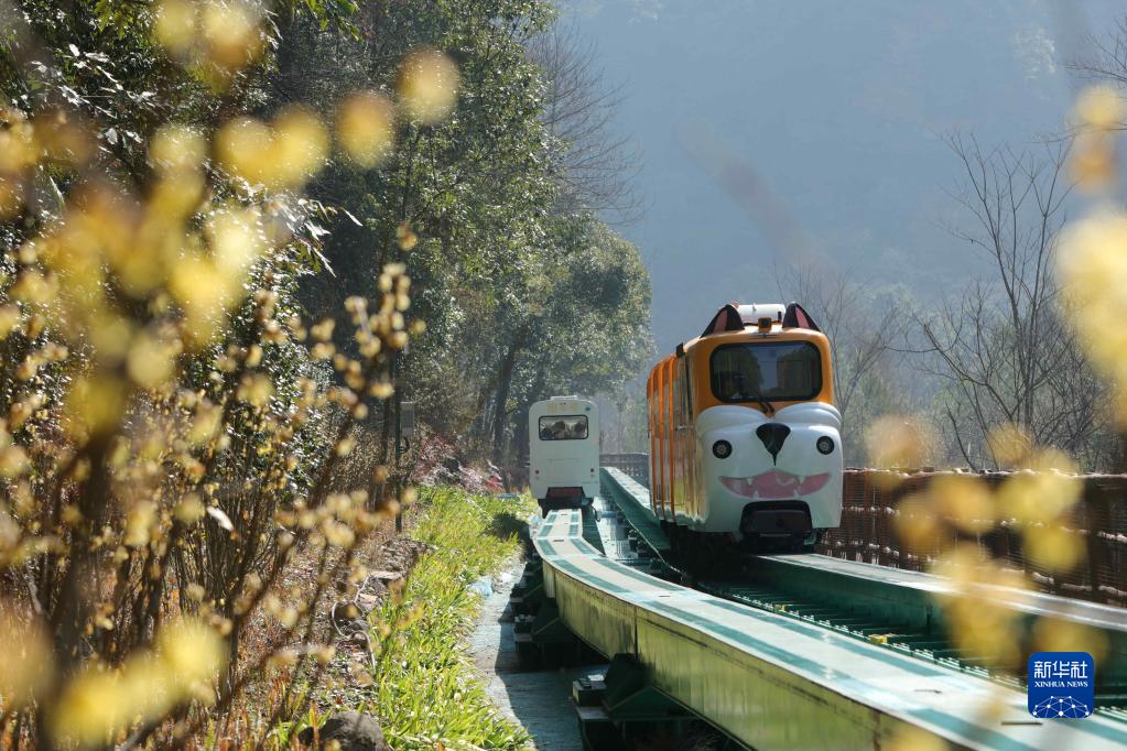 1月30日,游人乘十里畫(huà)廊觀(guān)光電車(chē)在湖南張家界國家森林公園游玩。