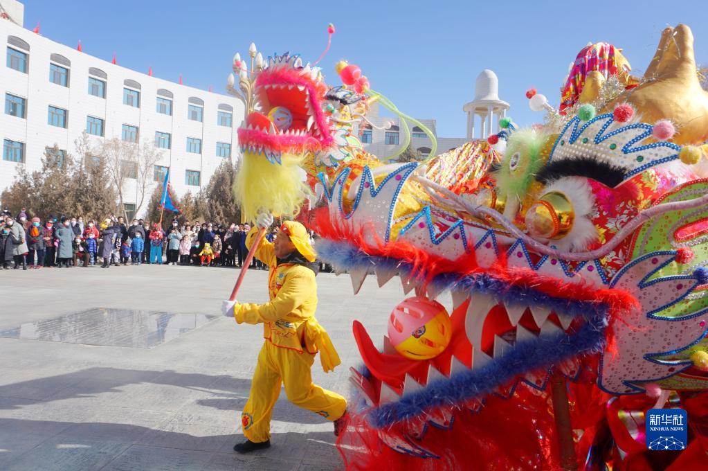 1月30日,甘肅省阿克塞哈薩克族自治縣社火隊在進(jìn)行舞龍表演。