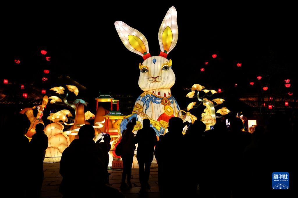 1月30日,在山東省棗莊市臺兒莊古城,游人在欣賞以“兔”元素為主題的花燈。