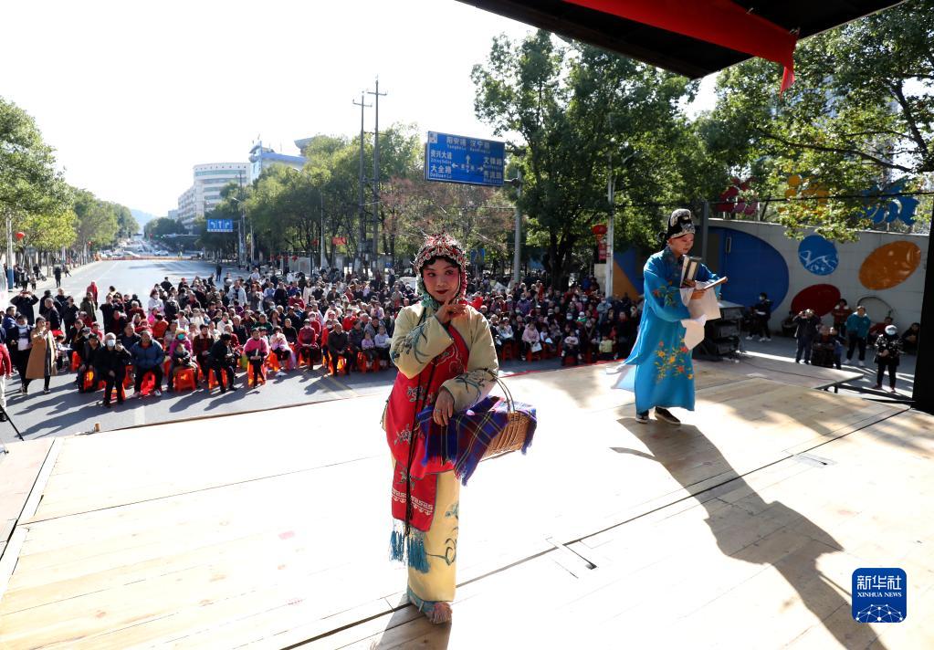 1月30日,在湖南省資興市人民廣場(chǎng),演員在舞臺上進(jìn)行花鼓戲表演。