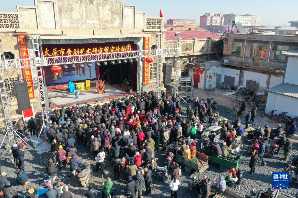 1月30日,太原市晉劇藝術(shù)研究院實(shí)驗二團演員在山西省太原市清徐縣孟封村演出(無(wú)人機照片)。