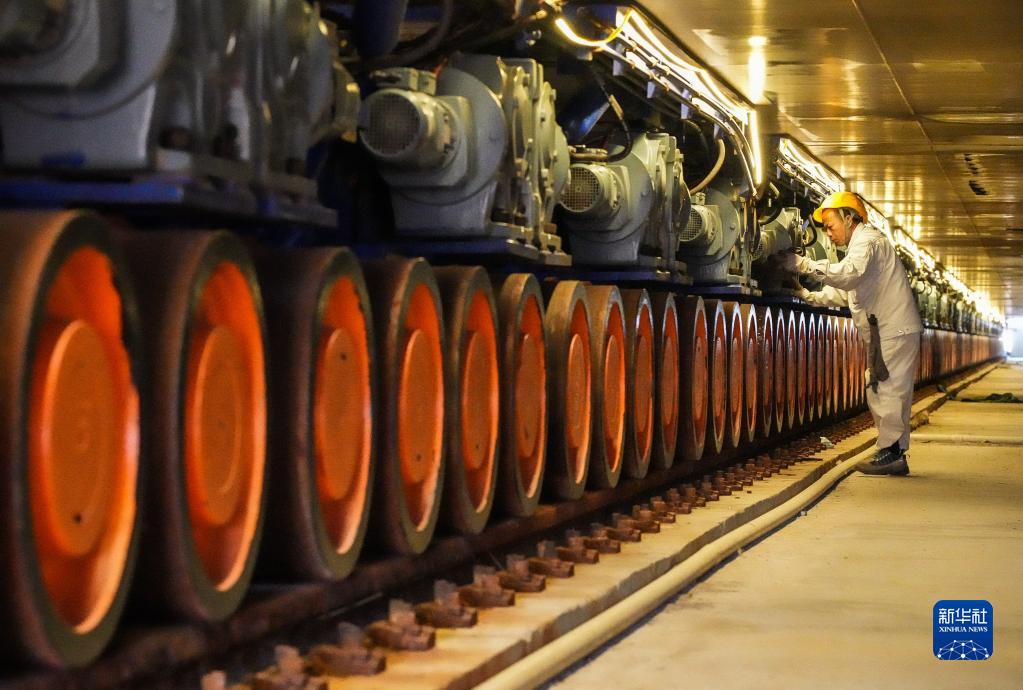 在中交四航局珠海牛頭島沉管智慧工廠(chǎng),施工人員為承載深中通道海底隧道最后一個(gè)管節(非標準管節、含最終接頭)的智能臺車(chē)進(jìn)行保養(1月30日攝)。