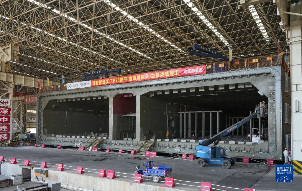 在中交四航局珠海牛頭島沉管智慧工廠(chǎng),施工人員為深中通道海底隧道最后一個(gè)管節(非標準管節、含最終接頭)一次舾裝做準備工作(1月30日攝)。