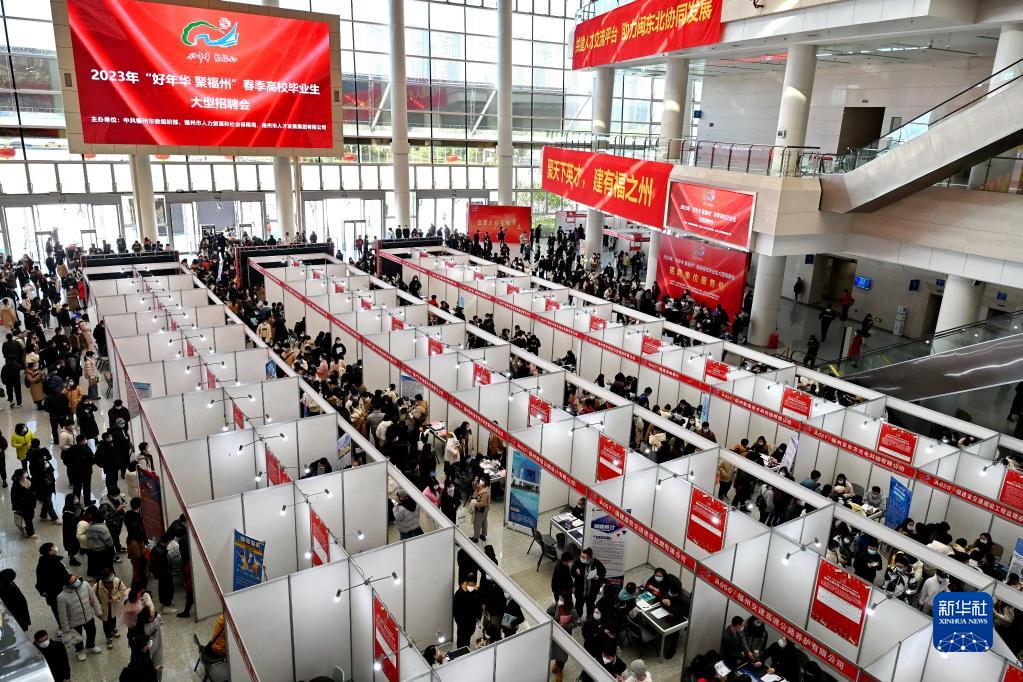1月31日拍攝的2023年“好年華 聚福州”春季高校畢業(yè)生大型招聘會(huì )現場(chǎng)。本次招聘活動(dòng)采用“線(xiàn)上+線(xiàn)下”形式,中共福州市委組織部、市人力資源和社會(huì )保障局等主辦單位共組織459家企事業(yè)單位提供近2萬(wàn)個(gè)崗位供應聘者挑選。