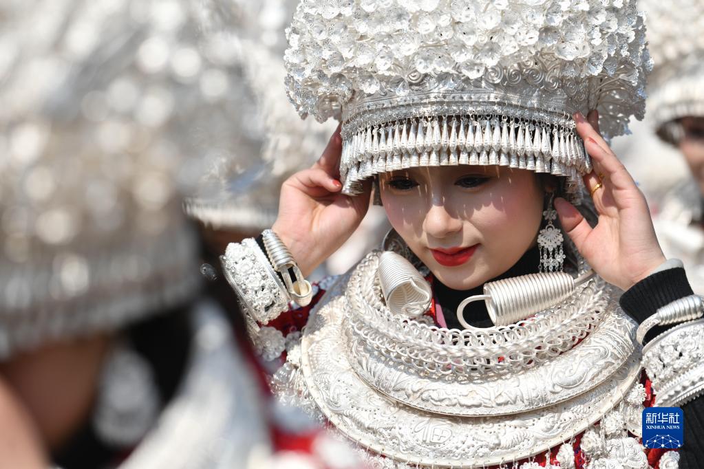 當日,在貴州省黃平縣谷隴鎮,26個(gè)村(居)的千余名苗族同胞身著(zhù)銀飾盛裝,跳板凳舞、吹蘆笙、唱苗歌,載歌載舞喜迎元宵佳節。