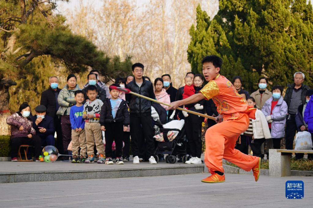 1月31日,武術(shù)愛(ài)好者在清河縣武松公園進(jìn)行器械表演。