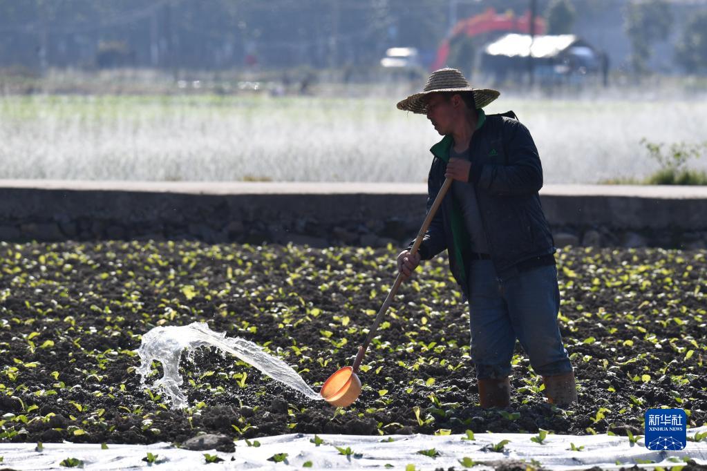 1月30日,福州市閩侯縣南通鎮蔬菜種植區一位菜農給菜苗澆水。