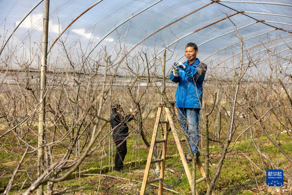 1月31日,村民在浙江省諸暨市同山鎮綠劍村的櫻桃大棚整枝。