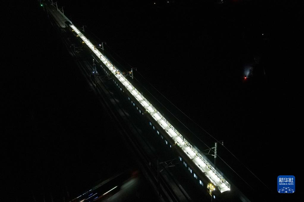 這是2月1日凌晨拍攝的接觸網(wǎng)綜合檢修列車(chē)作業(yè)平臺(無(wú)人機照片)。