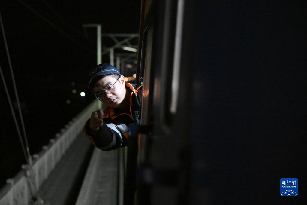 2月1日凌晨,在寧安高鐵安徽銅陵段,接觸網(wǎng)綜合檢修列車(chē)司機在發(fā)車(chē)前瞭望。