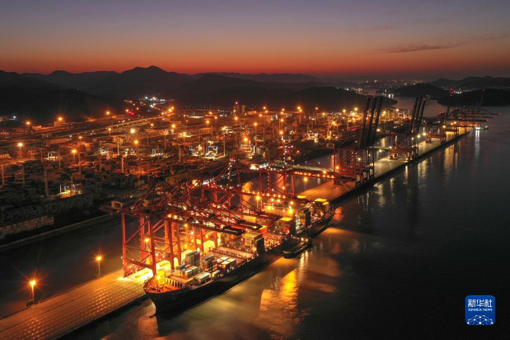 夜幕下,一艘貨輪??吭趯幉ㄖ凵礁鄞┥礁蹍^集裝箱碼頭(1月31日攝,無(wú)人機照片)。