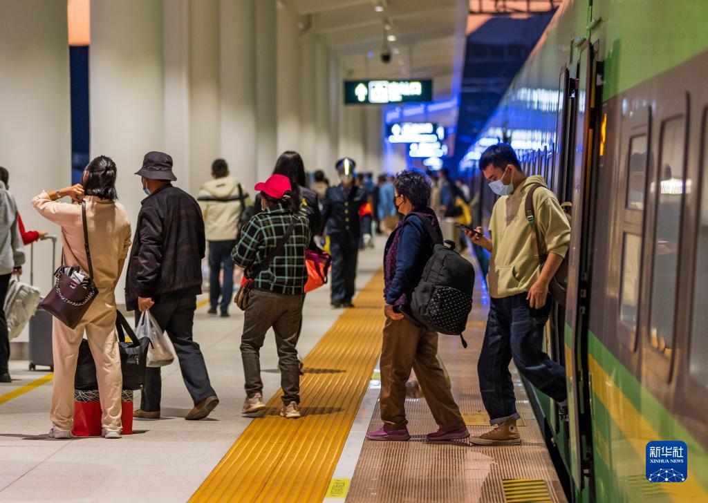 旅客乘坐動(dòng)車(chē)組列車(chē)抵達云南勐臘站(1月14日攝)。