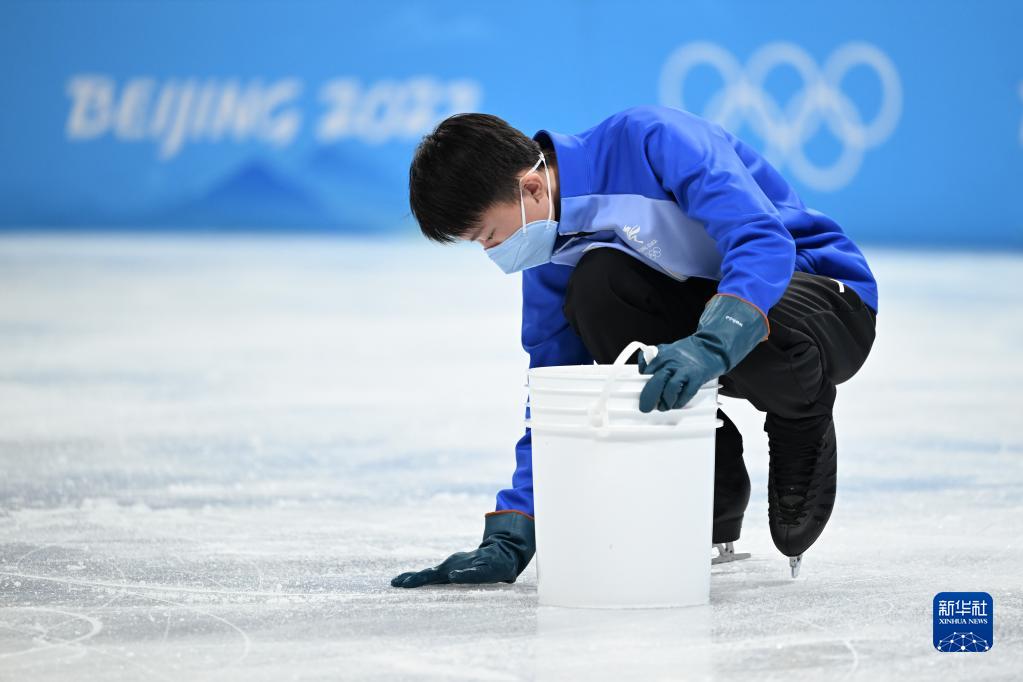 在北京冬奧會(huì )花樣滑冰男子單人滑自由滑比賽結束后,楊曦進(jìn)行冰面修補(2022年2月10日攝)。