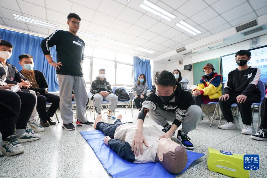 楊曦(下)在學(xué)校參加冬奧志愿者急救技能培訓(2021年11月27日攝)。