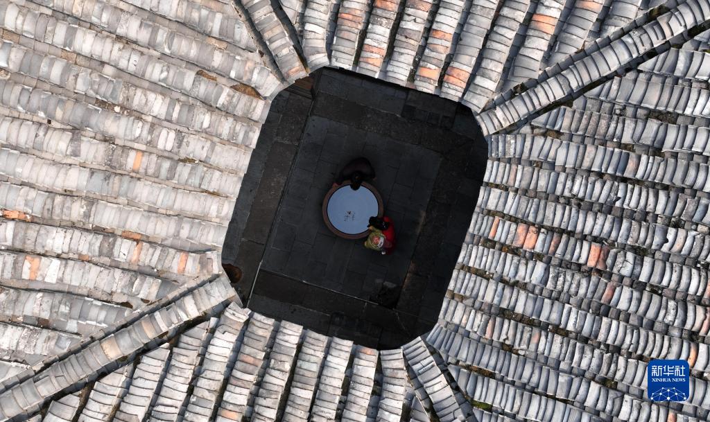 這是2月1日在舊州古鎮拍攝的一戶(hù)四合院的天井(無(wú)人機照片)。