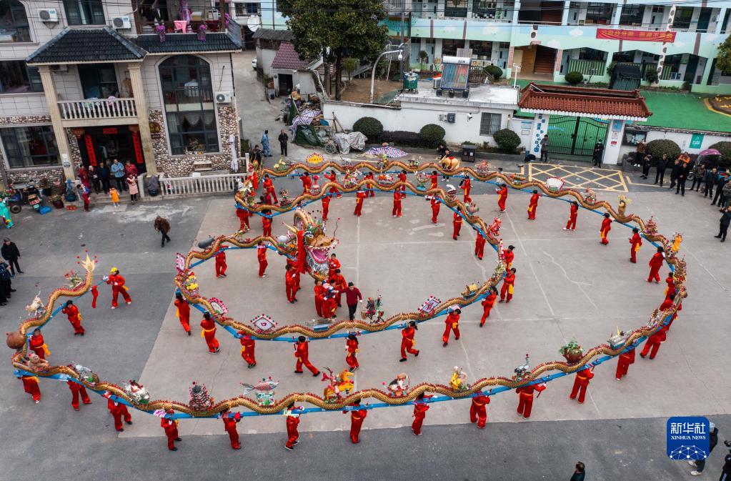 2月1日,窈口村女子板龍隊在湖源鄉進(jìn)行板龍舞龍表演(無(wú)人機照片)。