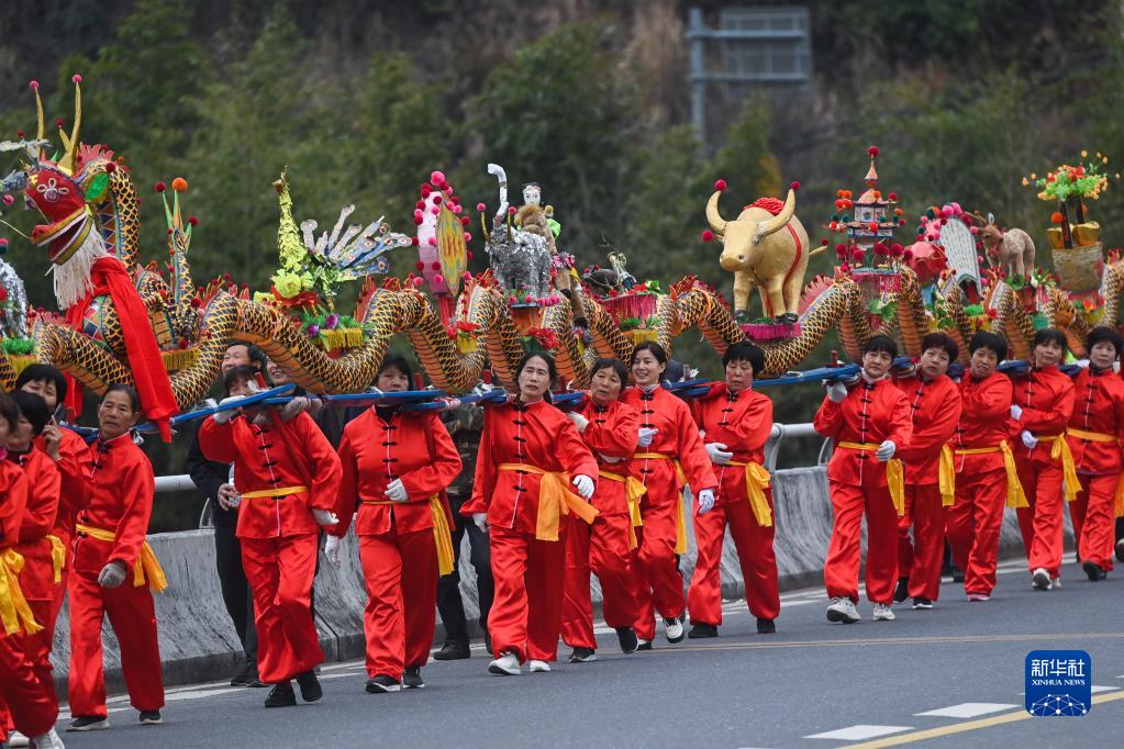 2月1日,窈口村女子板龍隊在湖源鄉走街串巷進(jìn)行板龍舞龍表演。