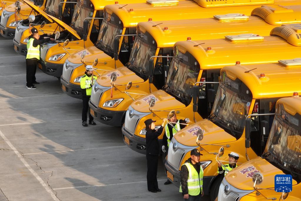 2月1日,江蘇省揚州市寶應縣公安局的交警對轄區校車(chē)進(jìn)行檢查(無(wú)人機照片)。
