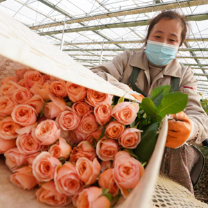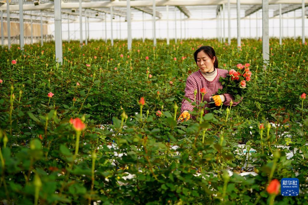 2月1日,村民在河北邱縣盛水灣玫瑰產(chǎn)業(yè)園采收玫瑰花。