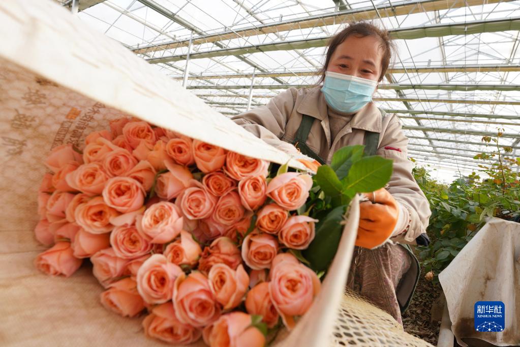 2月1日,村民在河北邱縣盛水灣玫瑰產(chǎn)業(yè)園打包采收的玫瑰花。