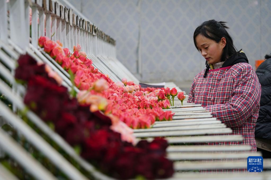 2月1日,村民在河北邱縣盛水灣玫瑰產(chǎn)業(yè)園整理玫瑰花。