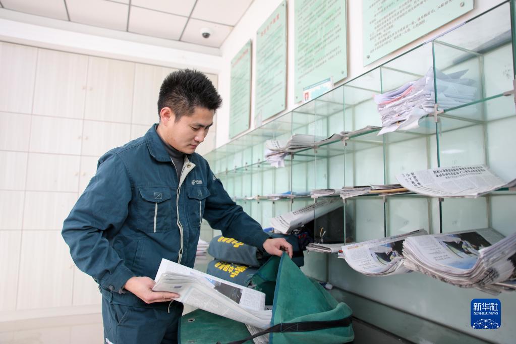 2月1日,謝菲俊將分揀好的報刊等郵件裝進(jìn)郵包。