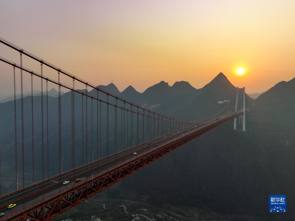 當日,貴州壩陵河大橋沐浴在夕陽(yáng)余暉下,美不勝收。