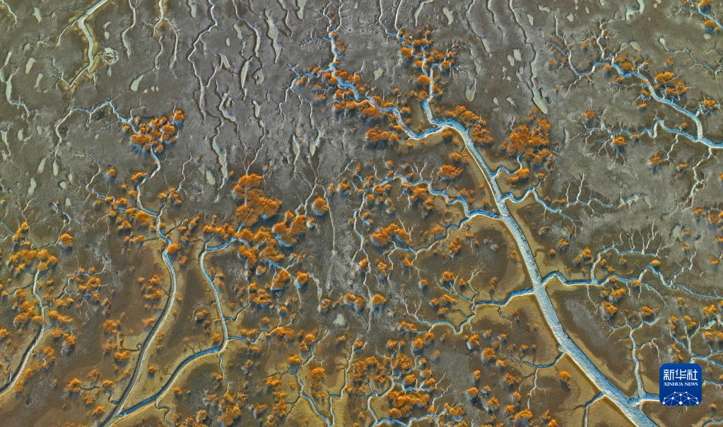 近日,在遼寧盤(pán)錦遼河口濕地,海水在潮汐作用下涌入遼河口濕地的潮溝,并凝結成冰,從高空看去,宛若蜿蜒曲折、形態(tài)各異的“冰脈”。